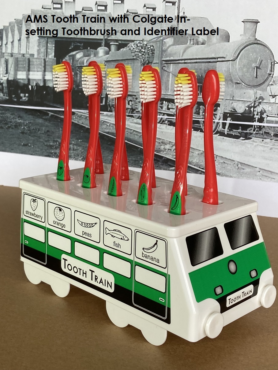 The Colgate In-setting toothbrushes fit our Tooth Train storage racks, with or without the lid. Contact us if you would like to have your symbols printed on Colgate toothbrushes or need storage, repacking and distribution services.