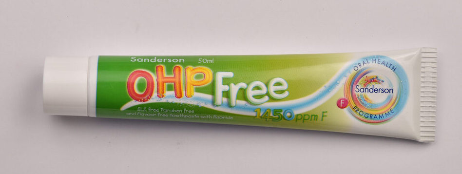 Sanderson OHPFree Toothpaste is flavourless and contains no parabens, SLS, sugar or animal products. It has 1450 ppm Fluoride to help protect teeth and enamel.